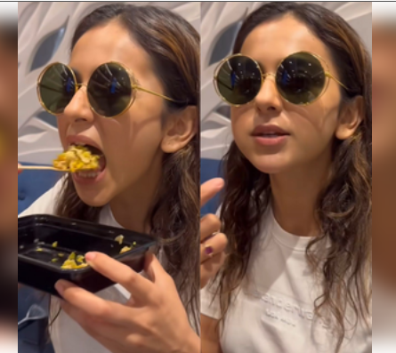 The video captures Rakul enjoying her breakfast, which seems to be poha, although it's not explicitly mentioned.