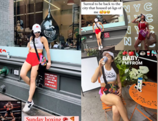 Flaunting her svelte figure in athleisure, the actress can be seen sipping coffee in a white crop top paired with fiery red shorts and sneakers.