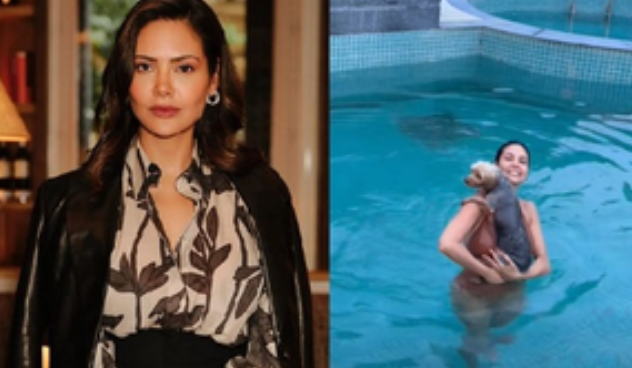 Esha took to her Instagram stories and shared a video of herself and her puppy enjoying the pool.
