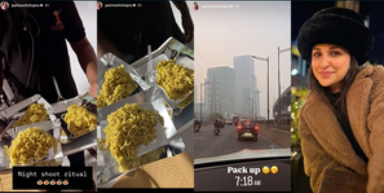 Parineeti took to Instagram stories, where she shared a picture of three plates full of Maggies noodles and captioned it: “Night shoot rituals.”