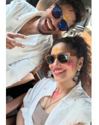 In one picture, Ankita is seen sitting inside a car wearing sunglasses and with gulal smeared on her cheeks and forehead. She was seen smiling as she showed her colour-filled palm to fans while clicking a selfie.