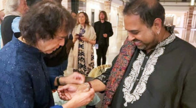 Mahadevan took to Instagram, where he shared a picture featuring him and the late tabla maestro. In the image, Zakir Hussain could be seen tying a band on Mahadevan’s hand.