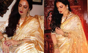 Veteran actress Rekha once again captivated her fans with her timeless elegance, this time donning a stunning handwoven gold tissue stripe saree. ...